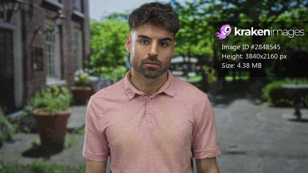 Man wearing a pink polo shirt looking down on street with brick building and potted plants; reflection.