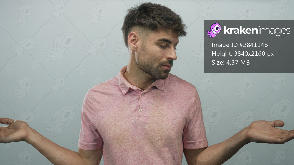 Man wearing a pink shirt shrugs hands and looks at palm in a grey studio while tilting head sideways; uncertainty.