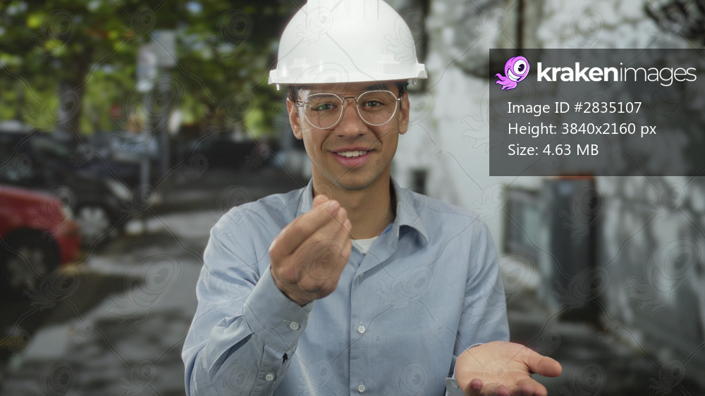 Man wearing a white hardhat points finger to open palm on a street with parked cars against a brick building; planning precision focus reliability.