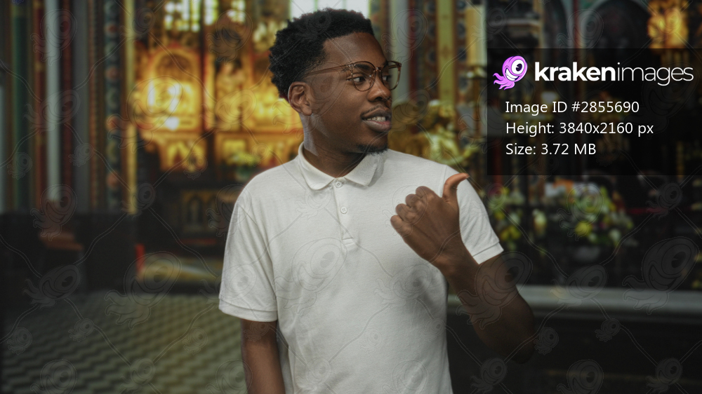 Man wearing a white polo shirt with finger to lips for silence in ornate church building interior by golden altar; serenity.