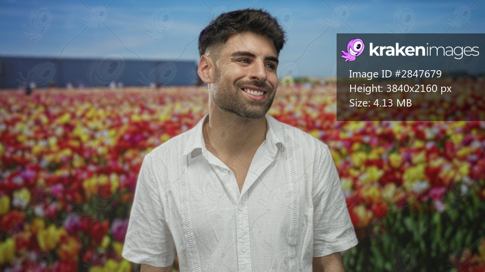 Man wearing a white shirt smiling in a vibrant tulip field studio setting while tilting his head gently; joy optimism.