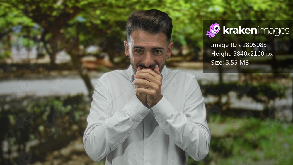 Man wearing a white shirt stands before dense green foliage in a sunny park giving thumbs up with both hands; approval.