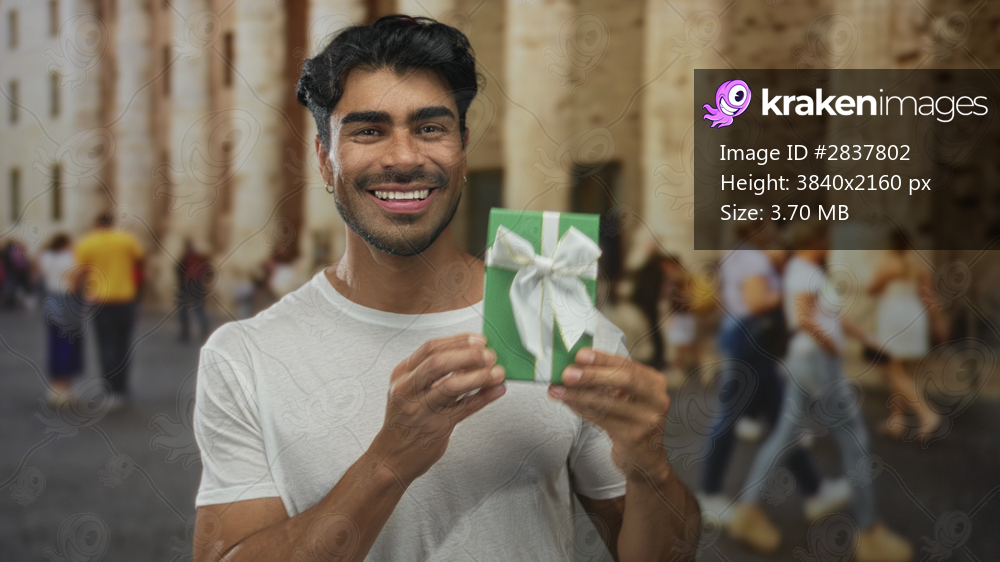 Man wearing a white t shirt holding a green gift box against ancient stone columns on a cobblestone street; happiness.