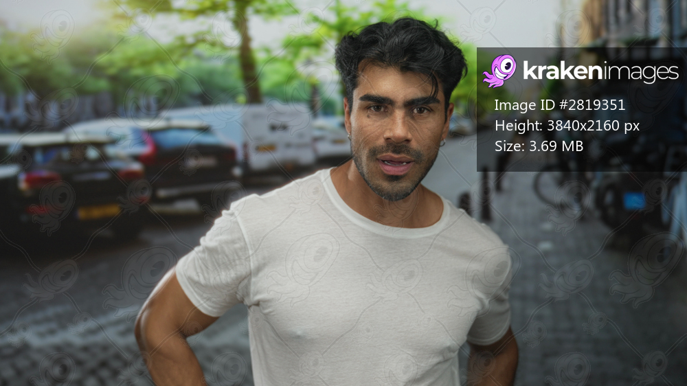 Man wearing a white t shirt stands with arms akimbo and closed eyes on a cobblestone city street; quiet reflection.