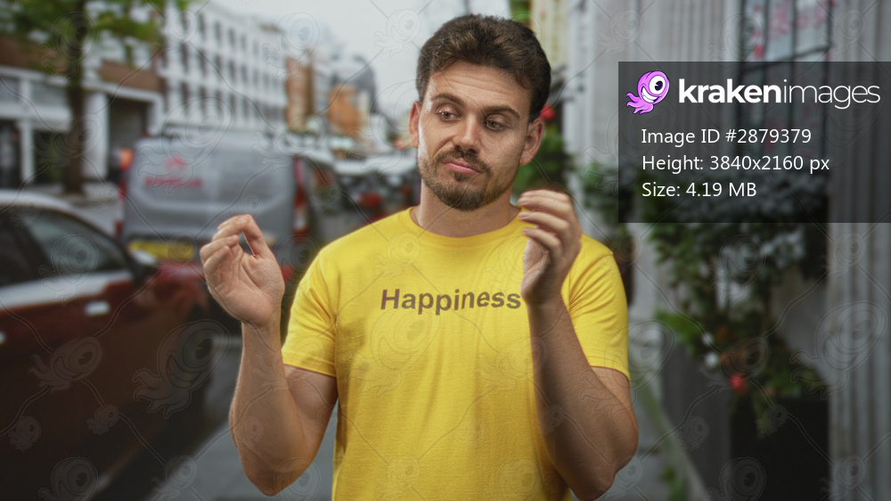 Man wearing a yellow t shirt reading happiness with hands clasped, standing by parked vans and sidewalk planters on a street with cars; skepticism.