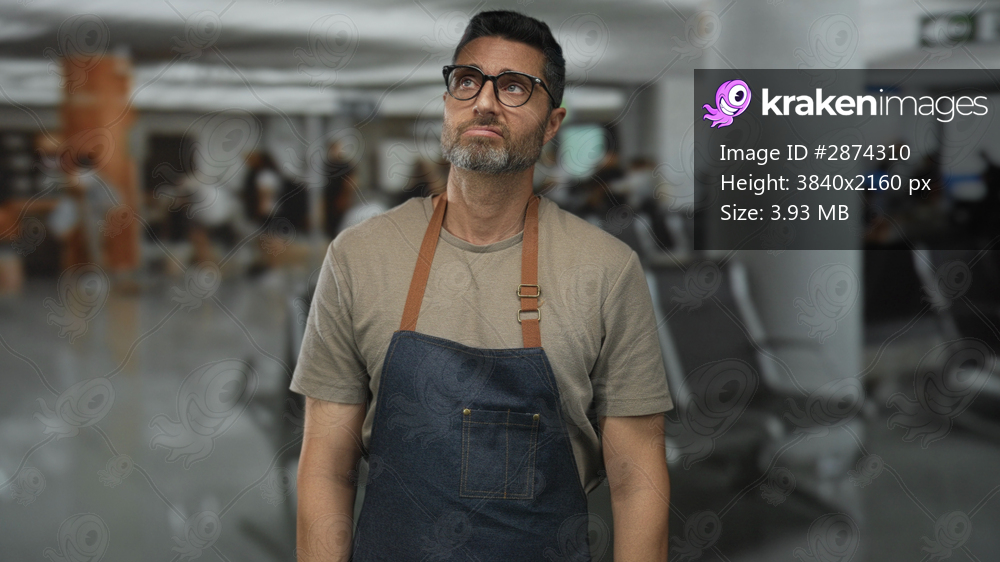 Man wearing apron and glasses, eyes closed and shoulders slightly slumped while standing in an airport terminal; weary waiting.