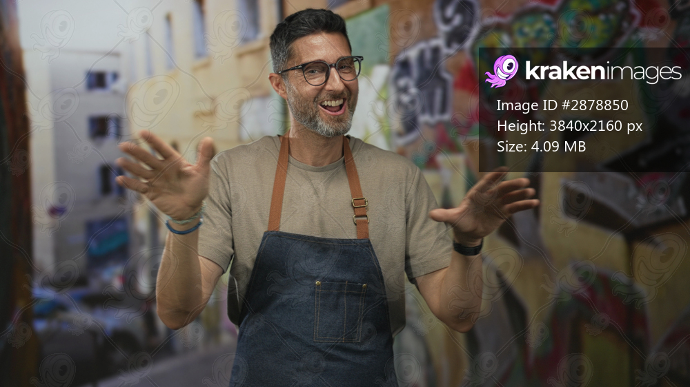Man wearing apron and glasses, smiling with hands raised in a playful gesturing pose beside graffiti wall on street; community joy.