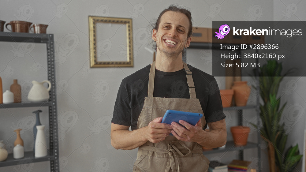 Man wearing apron holding a tablet and smiling among pottery shelves in studio; calm craftsmanship practice.