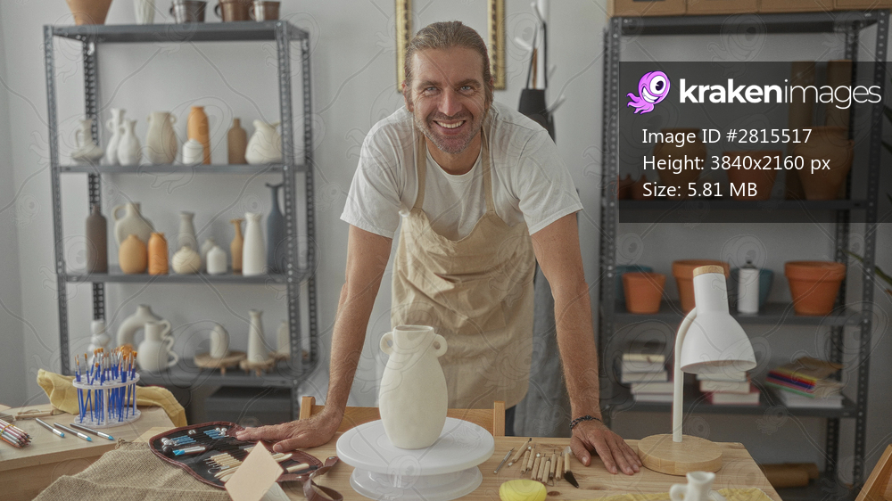 Man wearing apron leaning on wooden table touching a clay vase in a pottery studio lined with shelves of ceramic jars; serenity.