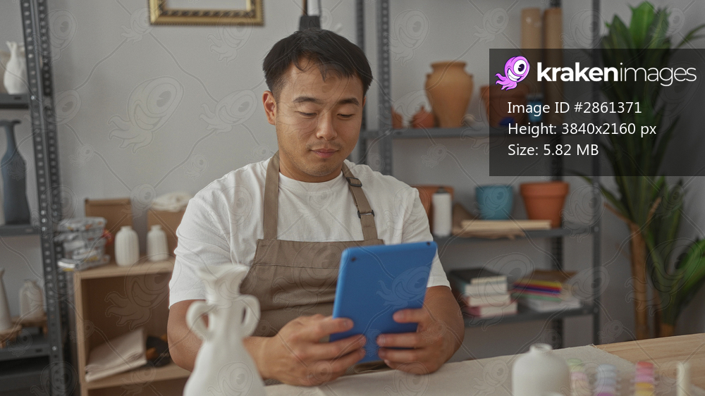 Man wearing apron smiling taps tablet among white clay pots and vases on wooden shelves in studio; serenity.