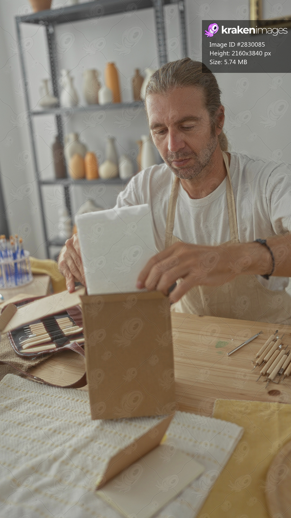 Man wearing apron uses hands to lift foam block from cardboard box on wooden table in pottery studio; concentration.