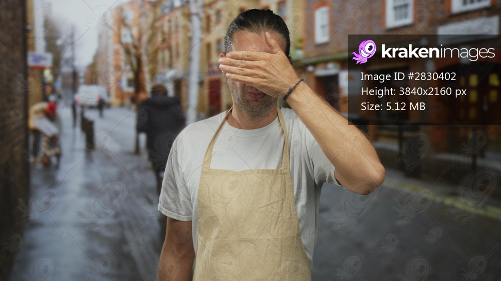 Man wearing beige apron covers face with hand on a rainy urban street in front of brick building; shame.