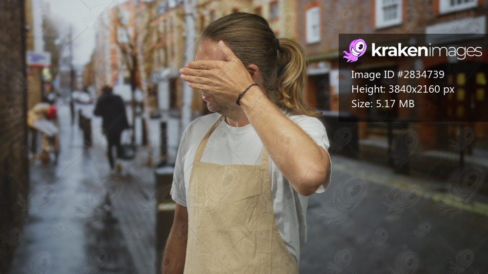 Man wearing beige apron covers face with hand on a rainy urban street in front of brick building; shame.