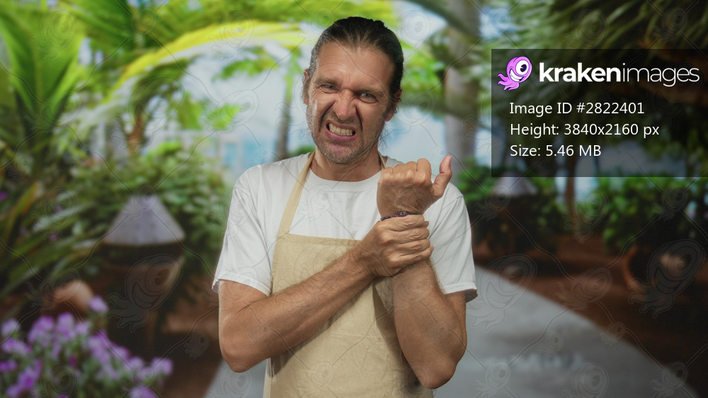 Man wearing beige apron grimaces while holding wrist on a park walkway lined with tropical greenery; discomfort.