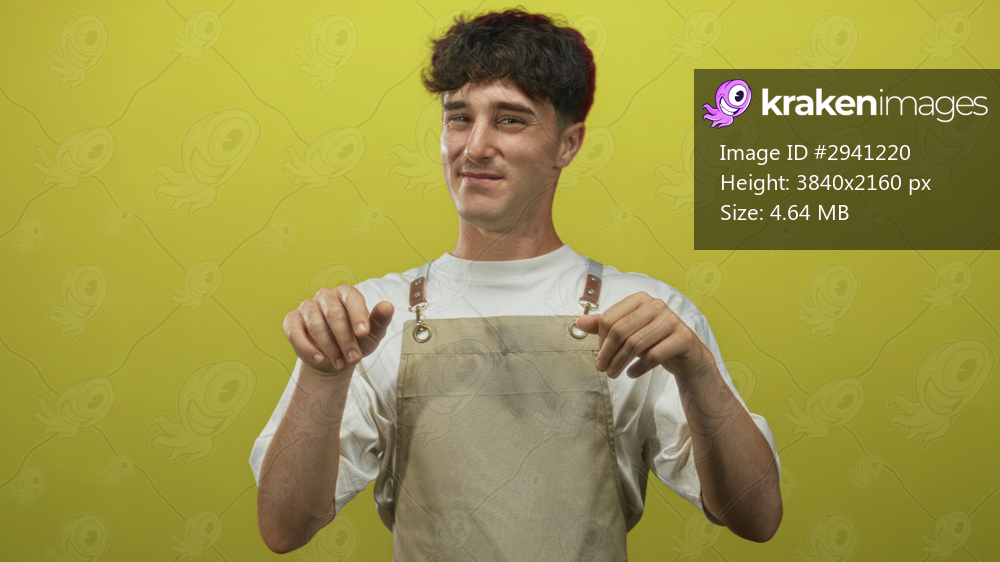 Man wearing beige apron with outstretched hands making an expressive gesture in studio on yellow backdrop; playful curiosity.