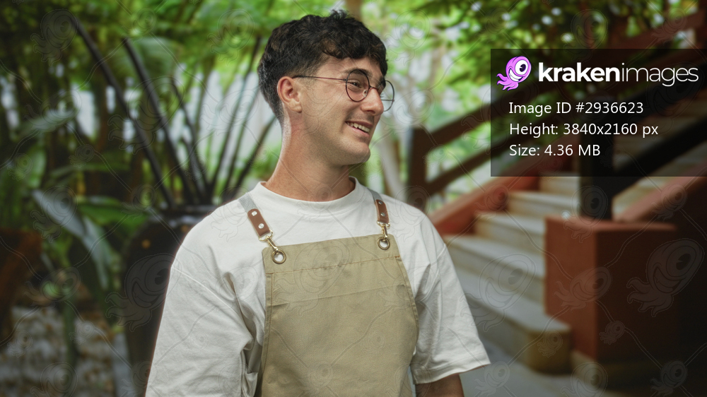 Man wearing beige apron and round glasses smiling and looking sideways on a building stairway among tropical plants; friendly relaxed contentment.