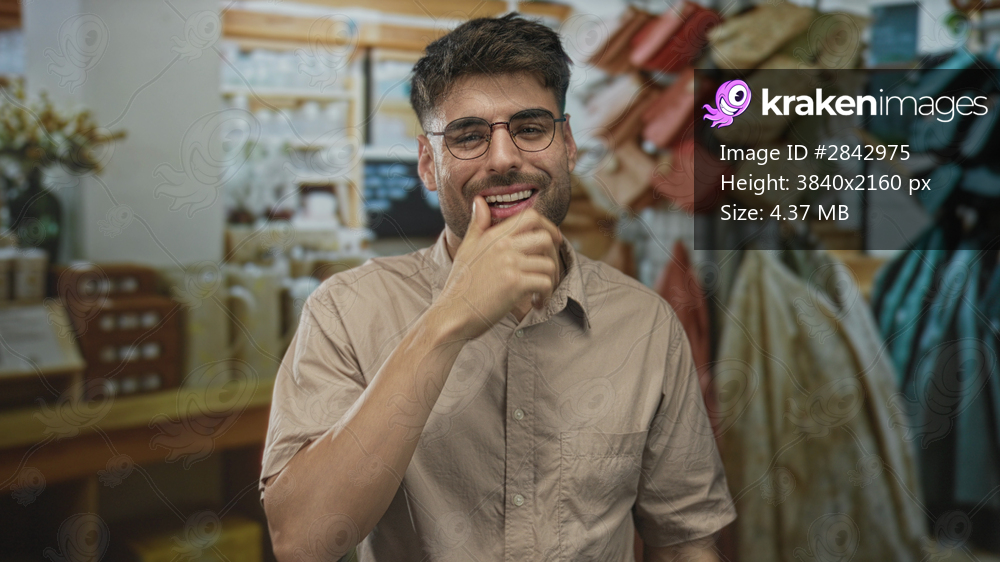 Man wearing beige shirt and glasses covering mouth with hand near clothing racks in retail building; amusement.
