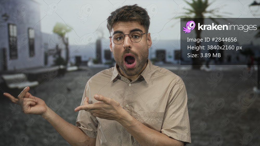 Man wearing beige shirt and glasses gestures with both hands and points finger to side on street; surprise.