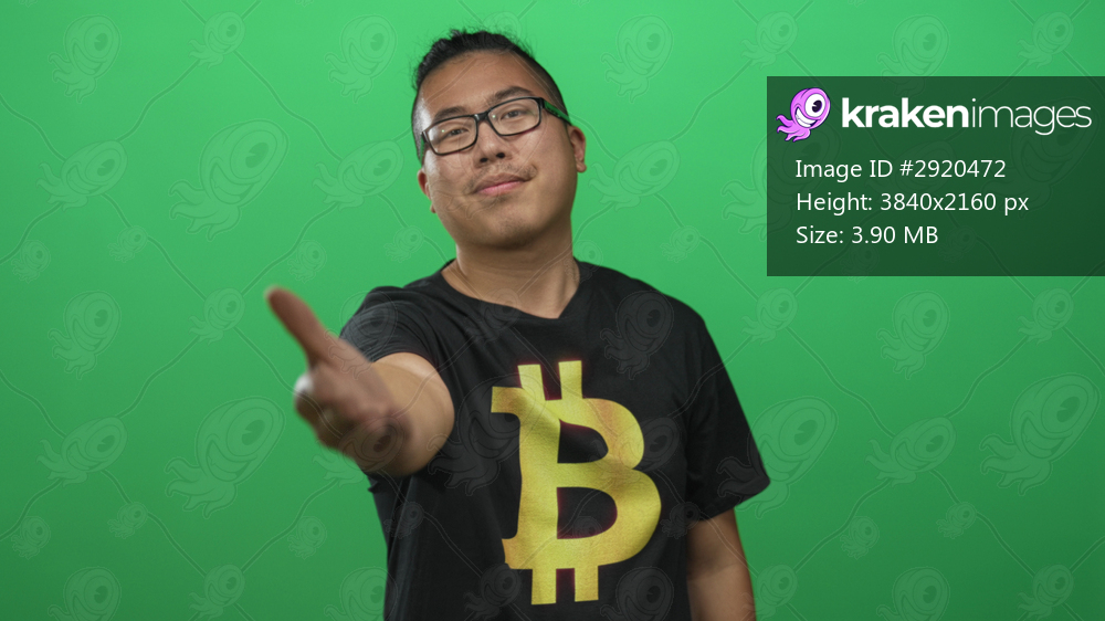 Man wearing bitcoin t shirt extends hand toward camera and smiles in green studio; trust invitation.