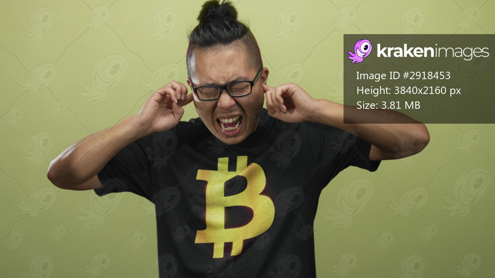 Man wearing bitcoin t shirt plugs fingers in ears in studio with olive green backdrop; annoyance silence.
