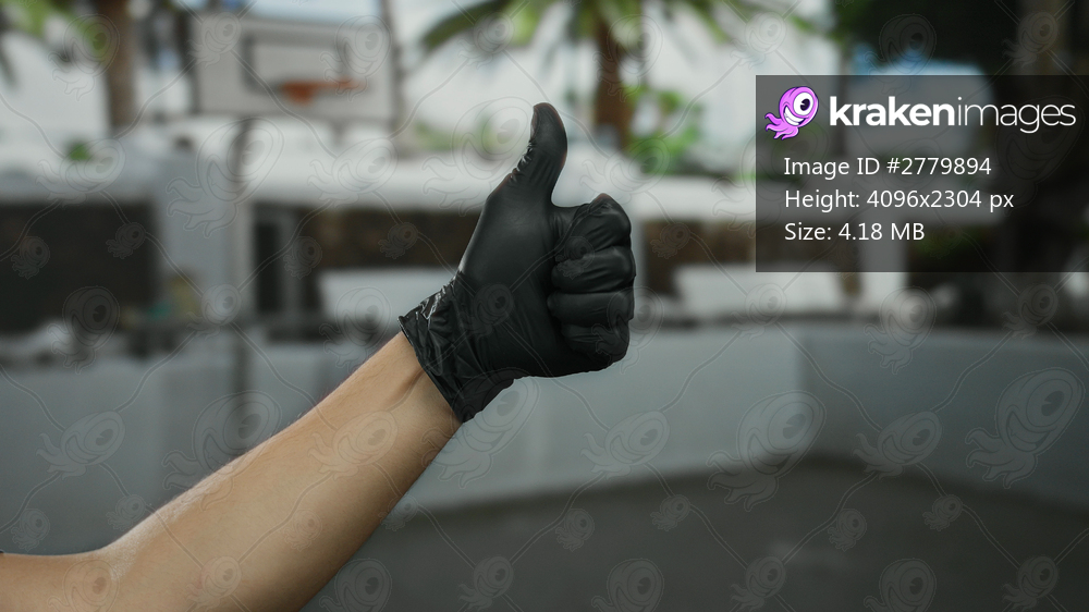 Man wearing black glove gestures on outdoor basketball court with palm trees and hoop in background under cloudy sky.