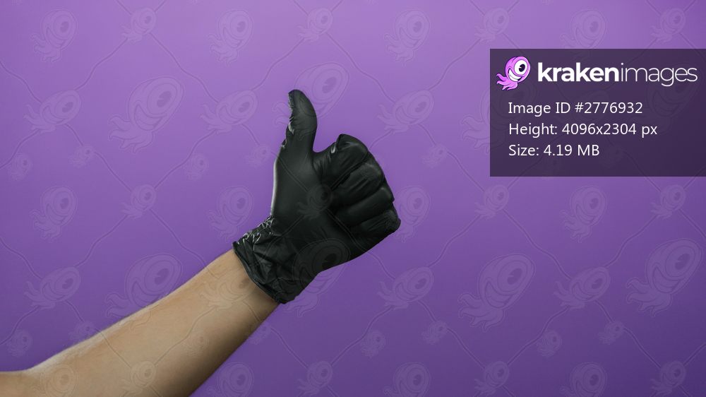 Man wearing black glove gives thumbs up against purple background, emphasizing positivity and hygiene.