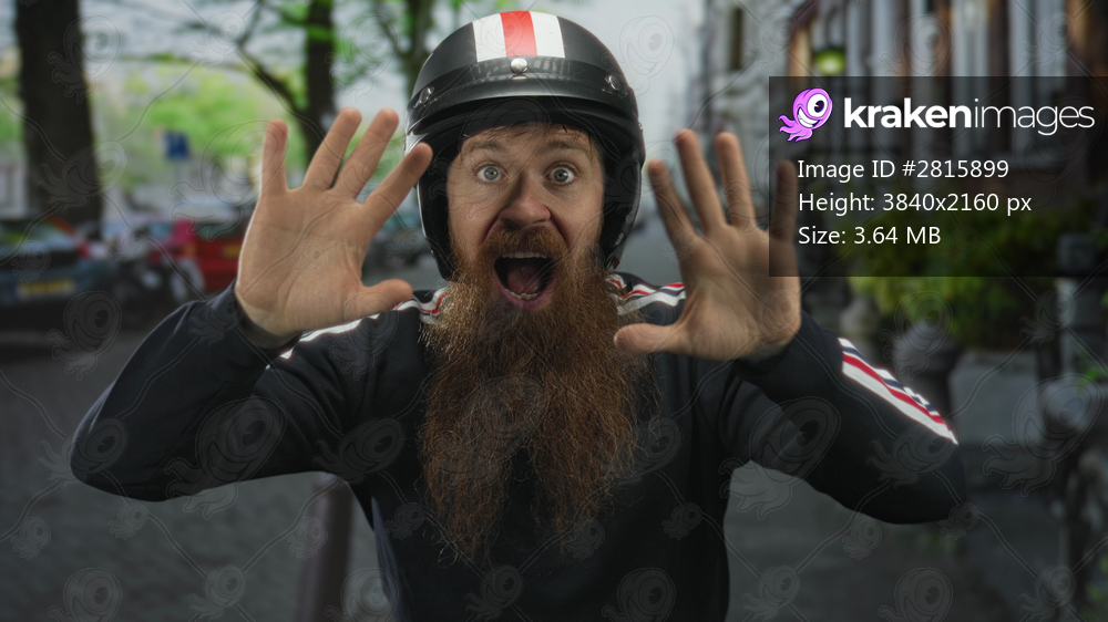 Man wearing black helmet and long red beard shouting with raised hands on narrow cobblestone street; urgent warning signal.