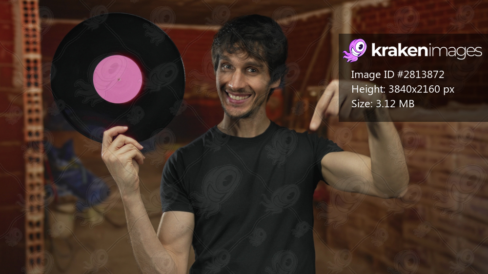 Man wearing black shirt smiling and pointing finger to vinyl record at indoor building site; fun joy excitement.