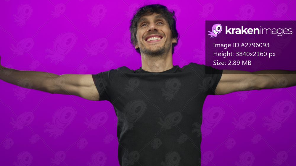 Man wearing black shirt spreads arms displaying bare forearms and smiles in purple studio set; joy freedom.