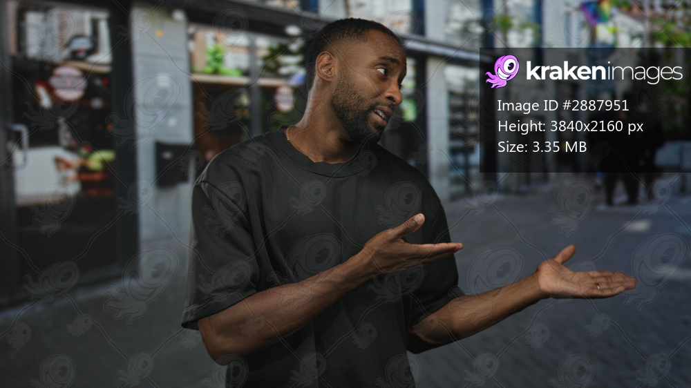 Man wearing black t shirt gesturing with open hands and palms visible on a busy city street near storefronts; thoughtful explanation engagement.