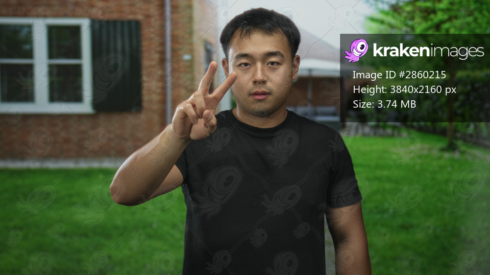 Man wearing black t shirt points finger upward at building entrance of suburban house on green lawn; determination.