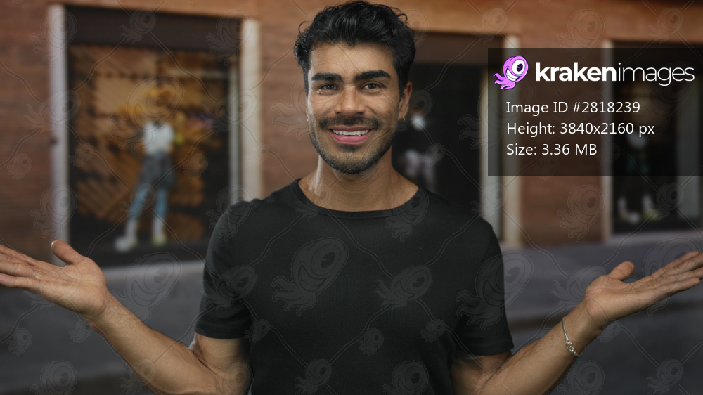 Man wearing black tee shirt holds arms out with palms up gesture on a city street with blurred retail windows behind him; uncertainty.