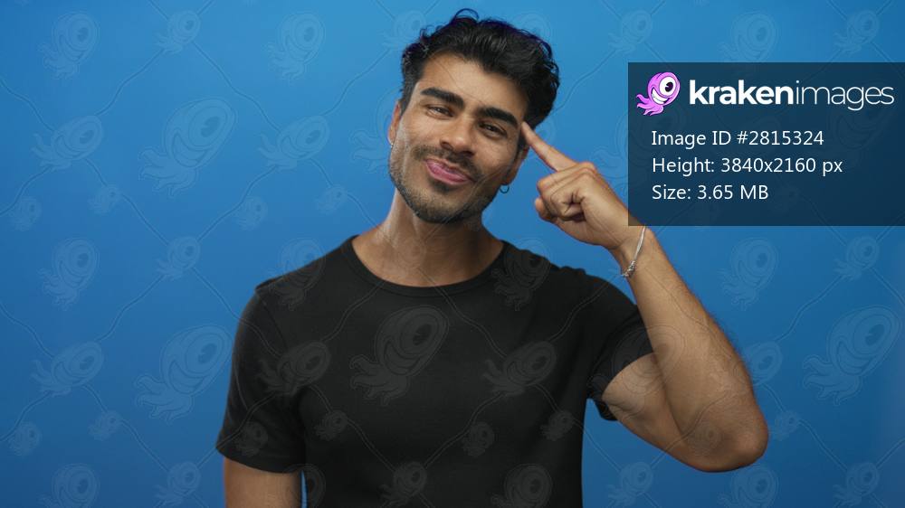 Man wearing black tshirt with finger pointing to head standing in studio with blue backdrop and slight smile; thoughtful reflection.