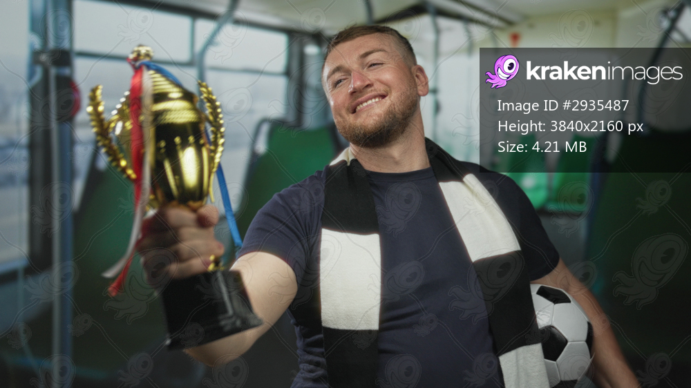 Man wearing black and white scarf holding a trophy and soccer ball, smiling and leaning in a crowded bus interior on a street; victory pride.