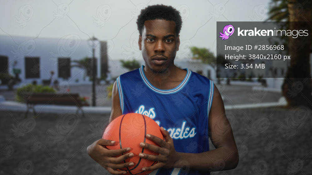 Man wearing blue basketball jersey holds basketball on sunny street beside wooden bench; confidence aspiration.