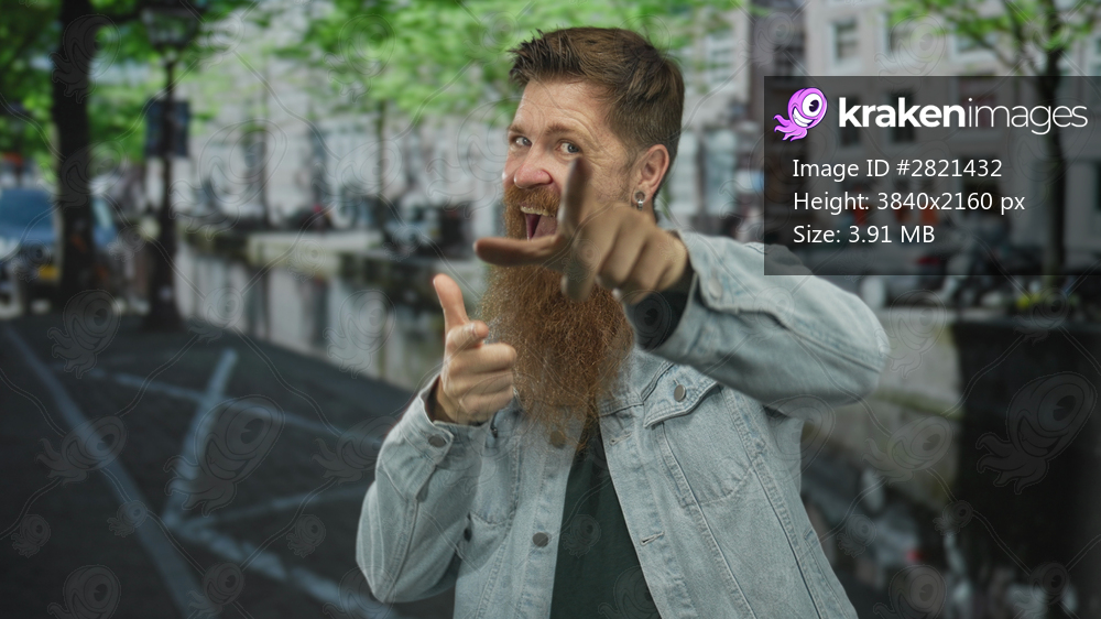 Man wearing blue denim jacket points finger to camera with wide smile on busy city street; confidence excitement.