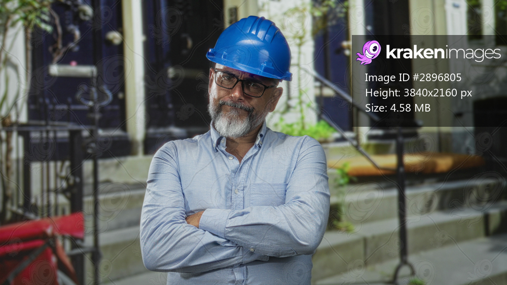 Man wearing blue hardhat with arms crossed at building entrance, neutral smirk expression; urban professional confidence.