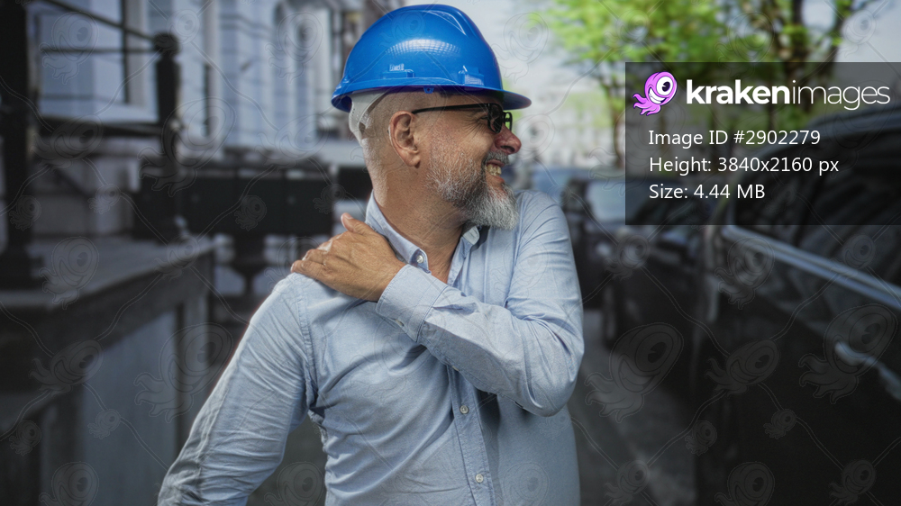 Man wearing blue hardhat touching his shoulder on a city street among parked cars and building facades; seasoned experience confidence.