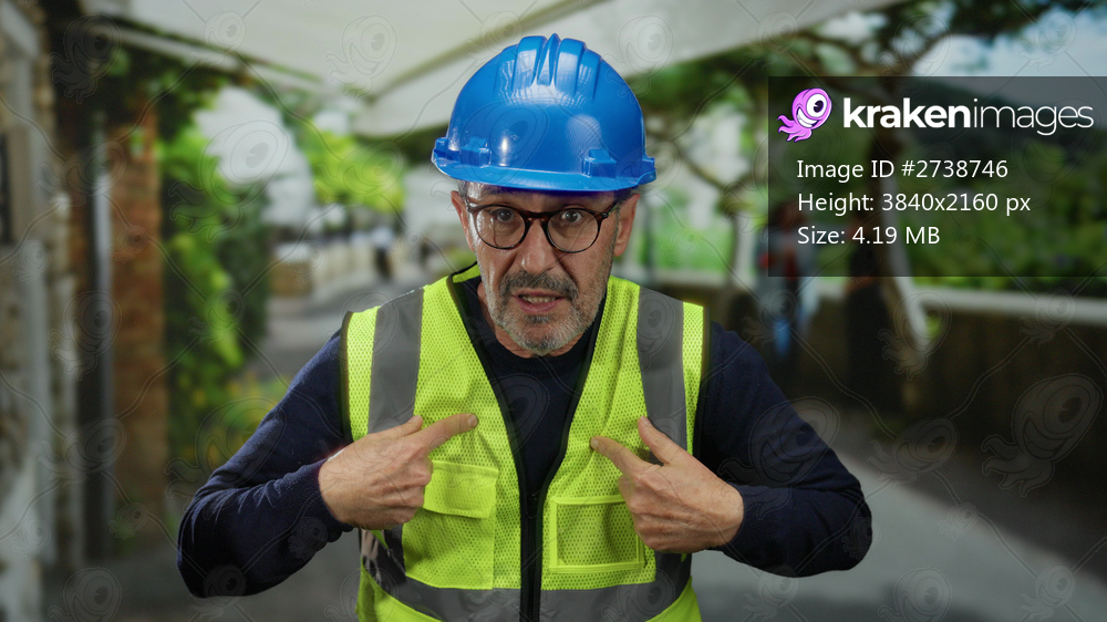 Man wearing blue hardhat and yellow vest points to himself in an urban park with greenery and blurred background, suggesting construction or safety themes outdoors. - Kraken Images