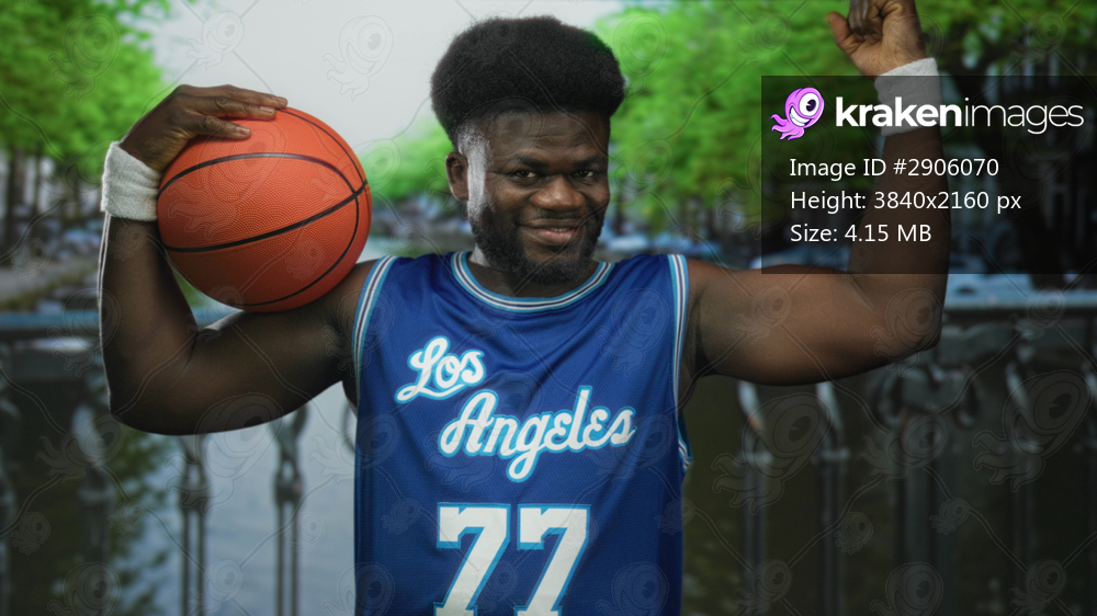 Man wearing blue jersey number 77 holds basketball on shoulder and flexes biceps on street canal bridge; athletic confidence.