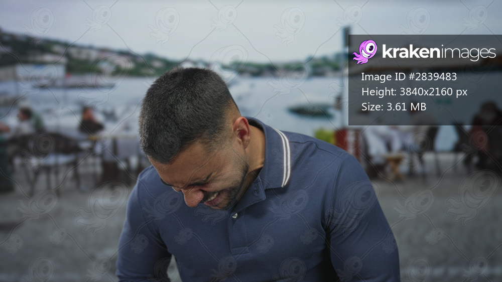 Man wearing blue polo shirt presses his stomach with both hands for stomachache on street; discomfort.