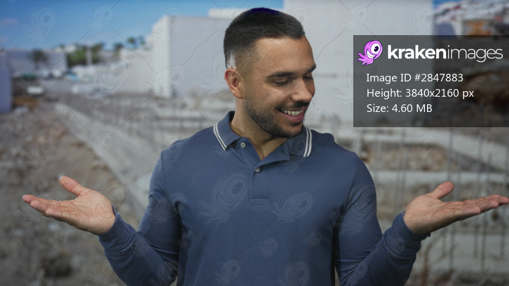 Man wearing blue polo shirt shrugs palms at a building site in broad daylight while smiling slightly; uncertainty.
