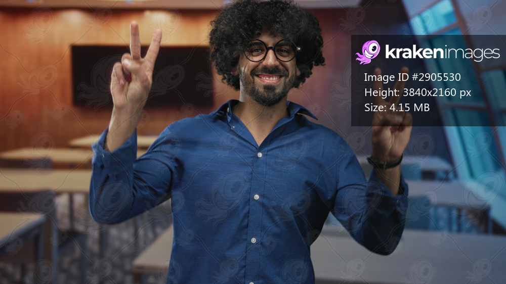 Man wearing blue shirt and glasses forming peace sign with both hands while smiling in classroom; optimism playful curiosity.
