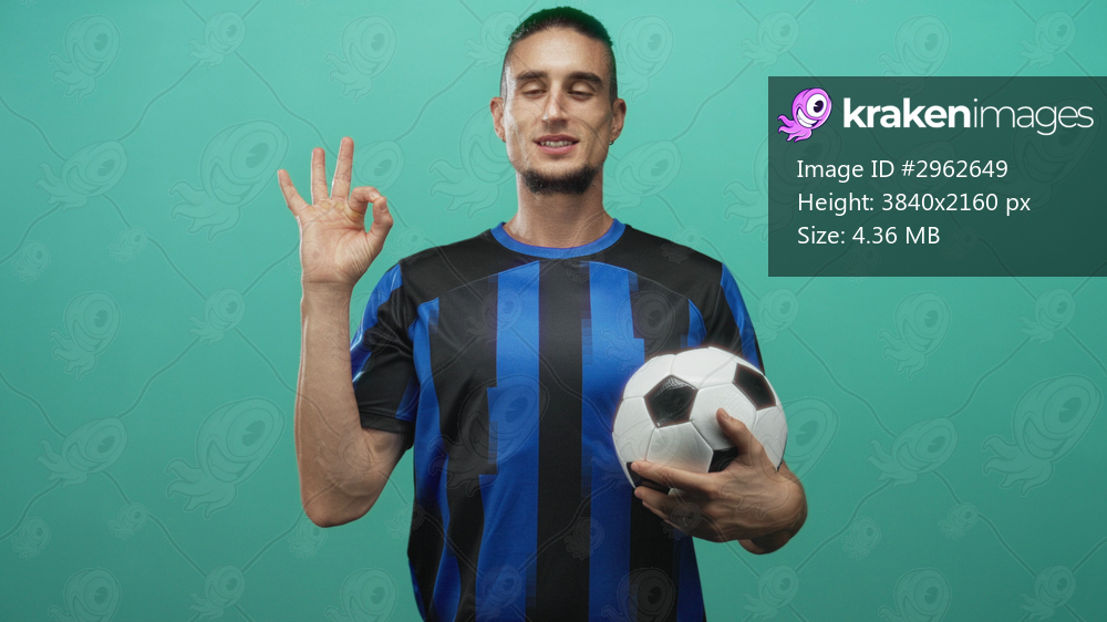 Man wearing blue striped jersey holding soccer ball under left arm with closed eyes and ok hand gesture in studio; calm focus concentration.