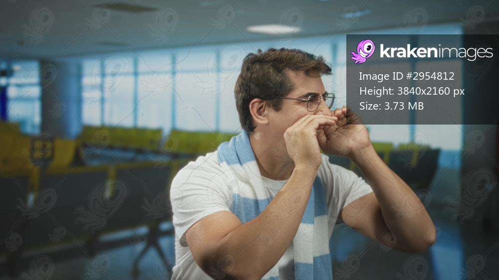 Man wearing blue and white scarf and glasses gesturing with hands in airport; anticipation team spirit.