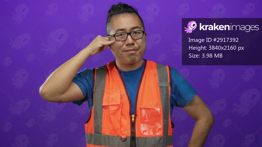 Man wearing bright orange reflective vest pointing index finger to temple while adjusting glasses in studio with purple backdrop; confidence safety readiness. - Kraken Images