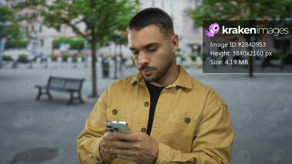 Man wearing brown jacket holding smartphone with bare hands on bustling urban street; digital curiosity.