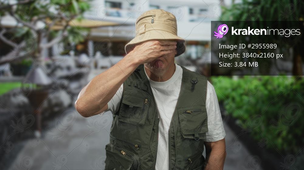 Man wearing bucket hat and fishing vest covering face with hand in hotel courtyard; privacy introspection.