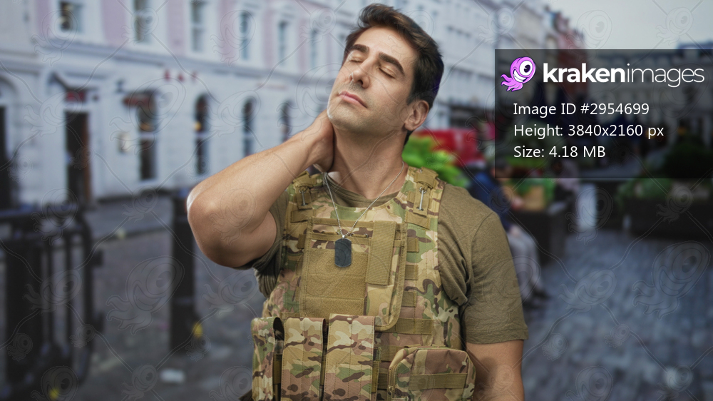 Man wearing camouflage military vest and dogtags touches his neck with one hand on a busy city street; fatigue duty.