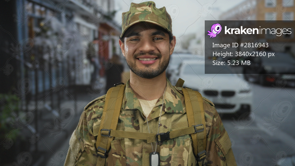 Man wearing camouflage uniform with backpack straps and dogtag smiles in urban street setting; pride duty honor.